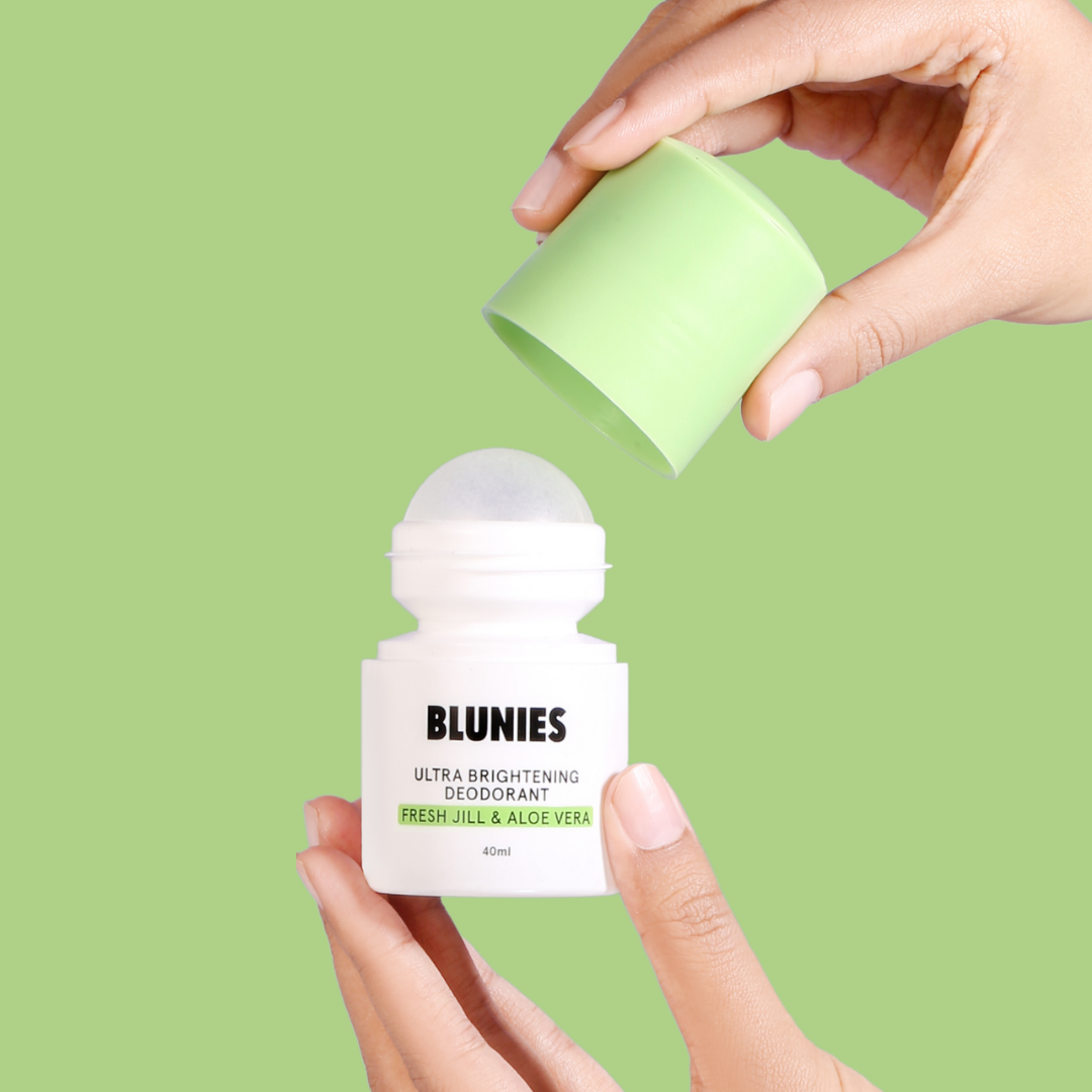 Blunies Ultra Brightening Deodorant is an ultra collagen roll-on deodorant anti-perspirant that brightens, smoothens underarm skin, and accelerates skin renewal. It is powered by supercharged brightening skincare ingredients like rainbow algae (cywhite compound), probiotics, aloe vera, probiotics, hyaluronic acid and AHAs.
